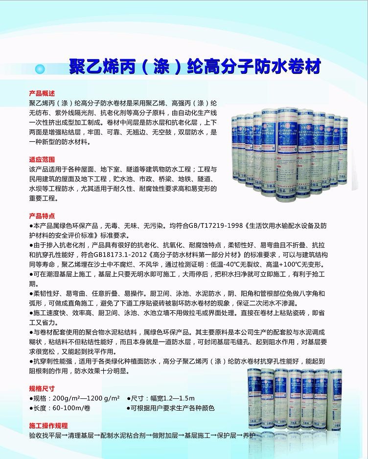 | 聚乙烯丙綸防水卷材 1000克/平方 | 杭州 | 無紡布 | 適用于各種屋面 地下室及隧道等防水工程 | ||